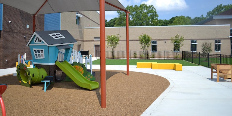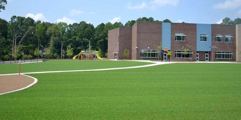 When an architect working on a project for the local school district reached out, the ForeverLawn of the Carolinas team was thrilled to be able to give the schools a safe, low-maintenance option for their large play areas. They knew that natural grass would never hold up to everyday play by elementary-aged children, not to mention the substantial long-term costs of maintaining those areas. A whopping 47,730 square feet of Playground Grass™ Extreme by ForeverLawn® was installed across multiple areas outside of Stough Elementary to create large, open spaces for various activities.